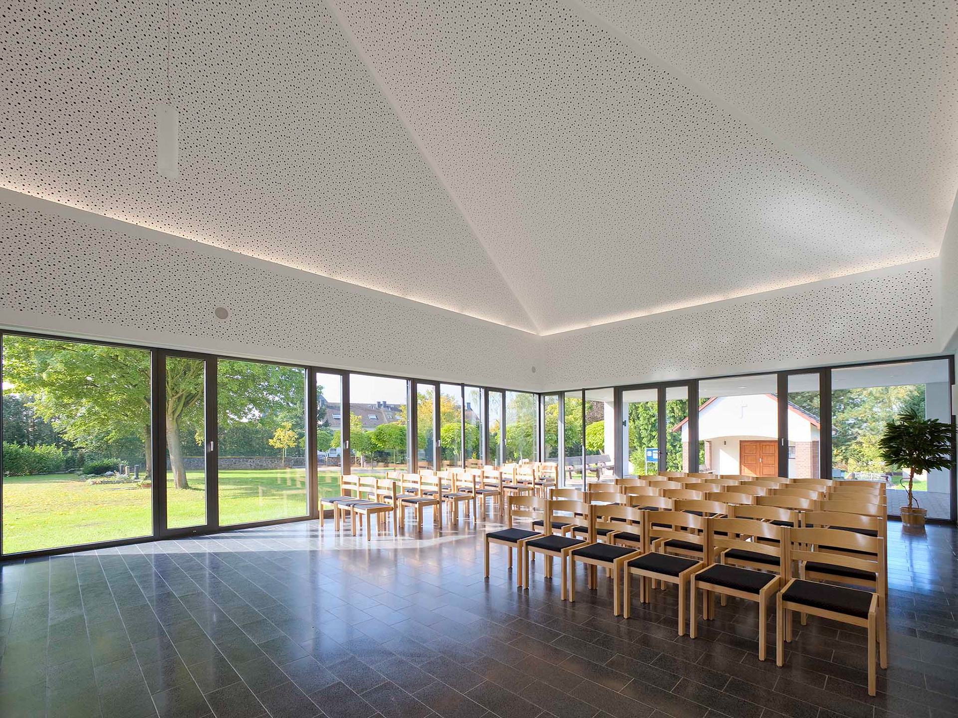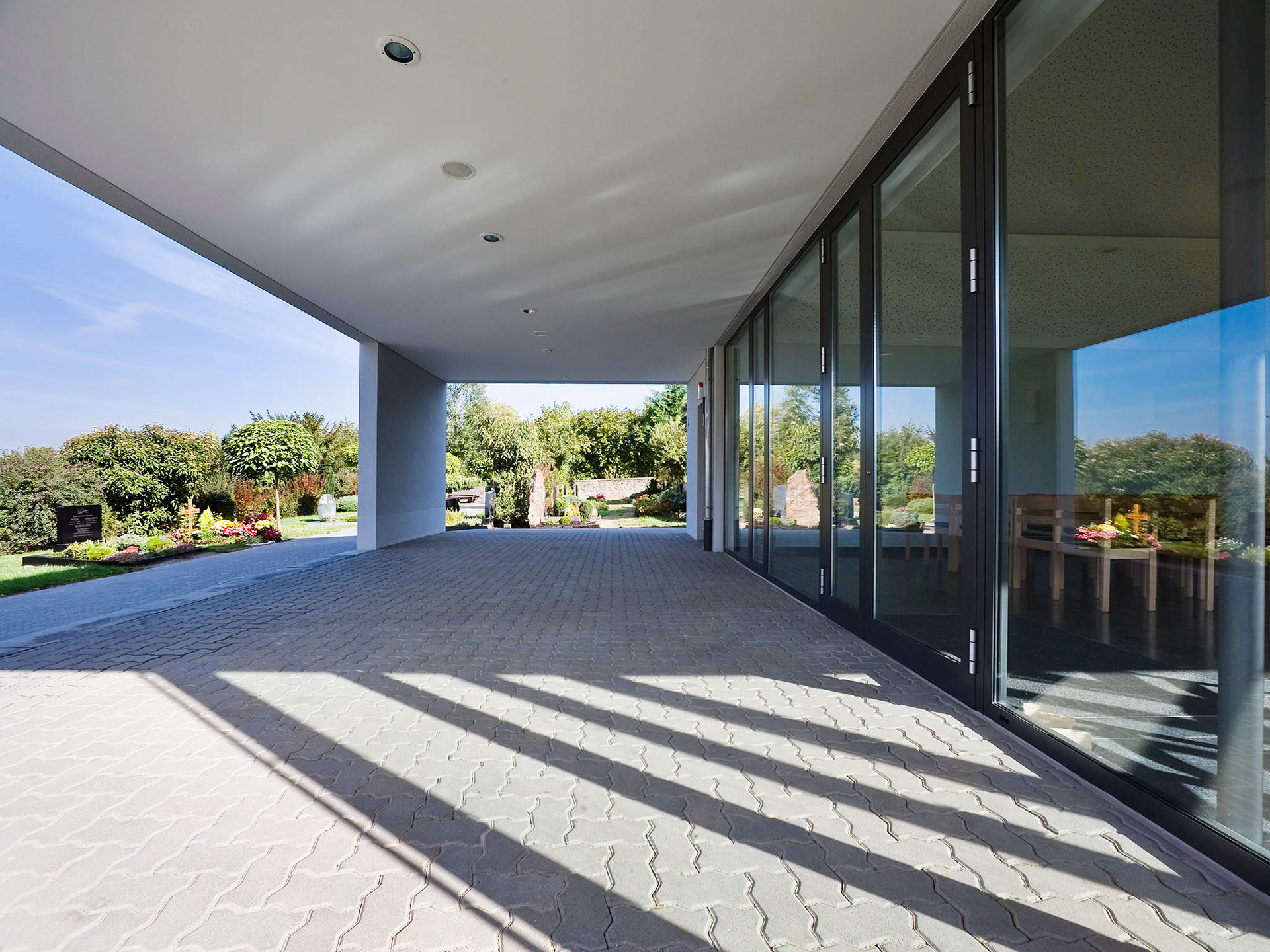 Neubau Trauerhalle für Aussegnungs- und Trauergottesdienste mit Neben- und Funktionsräumen (Lager, Büro, Sanitäranlagen).